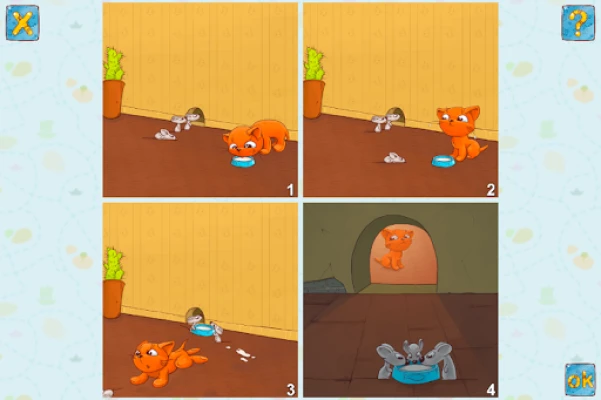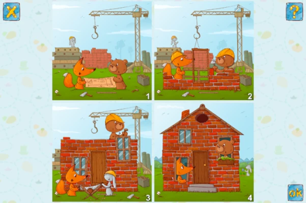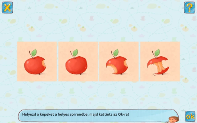 A játék kihívásai három különböző nehézségi szinten keresztül kínálnak fejlődési lehetőséget. Az *Egyszerű* szinten négy könnyen átlátható kép alkot sorozatot, tökéletes bevezetésként (például egy alma fejlődésének fázisai a teljestől a csutkáig). A *Normál* szinten szintén négy képet kell sorrendbe állítani, amelyek már egy rövid, összefüggő történetet mesélnek el. Végül a *Nehéz* szinten öt-hat képsorozat várja a gyermekeket, ahol hosszabb, összetettebb narratívákat kell kibogozniuk, mélyebb ok-okozati és időbeli összefüggéseket feltárva. Ez a progresszív rendszer biztosítja, hogy minden gyermek megtalálja a képességeinek megfelelő kihívást.
