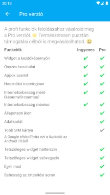 A még professzionálisabb adatkezelés és a fokozott kontroll érdekében érdemes felfedezni a prémium funkciókat. A továbbfejlesztett változat számos extra lehetőséget kínál, mint például az állapotsori ikonok megjelenítése és részletes adatkvóták beállítása. Kiemelt fontosságú a dual/multi SIM kártyás eszközök támogatása (Android 6-9 verziókon, az Android 10-es verziótól a Google eltávolította ezt a funkciót), ami még sokoldalúbbá teszi a felhasználást. Emellett szélesebb választékot biztosít az egyedi háttér- és szövegszínek terén, továbbá egy állapotsori internetsebesség-mérővel is kiegészül. Ez az adatforgalom-kezelő alkalmazás mindent megad, amire szüksége lehet a tudatos és kontrollált mobiladat-használathoz, így nincs szükség más megoldásra. Fejlesztőink folyamatosan azon dolgoznak, hogy a lehető legjobb élményt nyújtsák. Amennyiben bármilyen hibát észlel, kérjük, ossza meg velünk észrevételeit – hálásan fogadjuk segítségét! :)