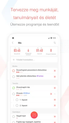 A Focus To-Do többet nyújt egyszerű időzítőnél; egy komplett szervezőrendszer a zsebében. Feladatkezelő funkcióival könnyedén rendszerezheti napját, heti szokásait alakíthatja ki ismétlődő bejegyzésekkel, és emlékeztetőkkel biztosíthatja, hogy soha ne feledkezzen meg a fontos határidőkről. Bontsa le nagyobb projektjeit kezelhető részfeladatokra, vagy használja a színkódolt prioritási szinteket a legfontosabb teendők kiemelésére. Ráadásul az alkalmazás zökkenőmentes szinkronizálást biztosít eszközök között – legyen szó telefonról, tabletről vagy számítógépről –, így céljai és listái mindig elérhetők, bárhol is legyen. Testreszabható időzítőjével – állítható Pomodoro- és szünethosszokkal, valamint folyamatos üzemmóddal – precízen az igényeire szabhatja a munkafolyamatát.