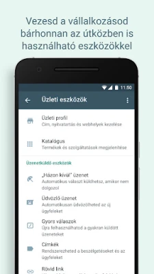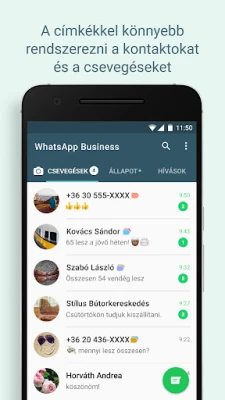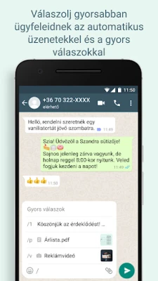 WhatsApp Business: a megszokott WhatsApp élmény üzleti eszközökkel kiegészítve. Segít okosabban dolgozni, bizalmat építeni és fejleszteni vállalkozásod. Küldj automatikus válaszokat, rendszerezd beszélgetéseid címkékkel, és ne maradj le egyetlen lehetőségről sem.